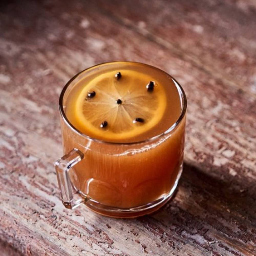 Method: Build in glass (fill with hot water to taste), garnish with clove studded orange wheel.